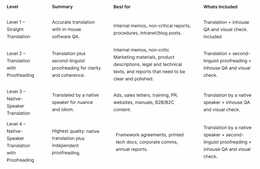 We understand that all projects are unique, and so are our clients’ needs. That’s why we offer multiple service levels, allowing you to select the translation service that best suits your objectives for your assignment. This ensures you only pay for the quality you need, resulting in significant cost savings.